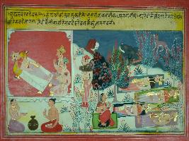 | Description / विवरण | Miniature painting based on Mahabharat depicting Yudhisthir telling Krishna that in the way animals awake in jungles, the all brahmans, ganas and women are awake in the kingdom for war. |