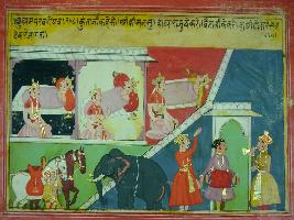 | Description / विवरण | Miniature painting based on Mahabharat depicting Yudhisthir telling Krishna that elephant and horses all are ready for war. |