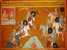 | Description / विवरण | Miniature painting based on Prithviraj Raso depicting Prithviraj thinking about the right path Sumarg and wrong path Kumarg . To protect motherland and to stay with wife is the good aspect of life while to indulge in the earthly desire is the wrong path. He again compares Jaichand with Kaal that is depicted at the lower part. |