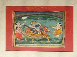 | Description / विवरण | It is a painting in which four armed Vishnu is shown sitted on a platform holding his attributes, flanked by three attendants. |
