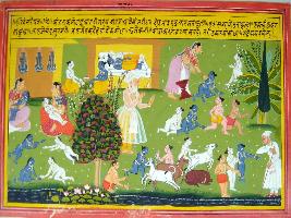 | Description / विवरण | Miniature painting based on Harivansha depicting different scenes of Yashoda s love to Krishna as well as to Balram. Both Krishna and Balram too are shown playing. Nand shown with stick follow to Krishna and Balram. They two are playing with cows. |
