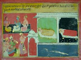 | Description / विवरण | Miniature painting based on Mahabharat depicting Krishna in house of Vidur, meeting Kunti. She asked Shri Krishna about well being of Pandavas and about the process of worshipping of Brahmans. She asked him why those who do wrong deeds are living good life and are happy and telling to the world about their well being. This line is compared here with man playing instrument such as blowing of conch and drums to tell the world. |