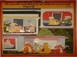 | Description / विवरण | Miniature painting based on Mullah-do-Piyaja depicting that Sardar Mirza s son is exploiting his money by indulging himself in drinks and other activities. |