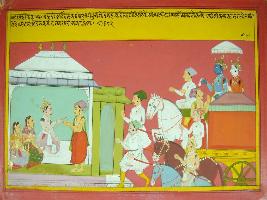 | Description / विवरण | Miniature painting based on Harivansha depicting a scene in right portion in which a man standing with folded hand in front of king, queen and a daughter. In left portion, Krishna coming by Rath along his attendant. |