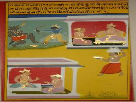 | Description / विवरण | Miniature painting based on Sarangadhar depicting Ram killing a demon. It also depicts a king and his minister in the upper and lower parts of the painting. |