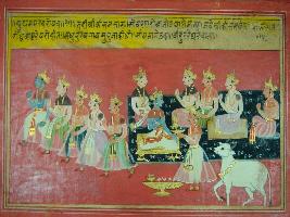 | Description / विवरण | Miniature painting based on Mahabharat depicting Sri Krishna meeting king Dhritrashtra and king giving him and his sardar seats. Then purohit of Dhritarashtra came and Krishna worshipped him with nectar and cow. Then he left for house of Vidur. |