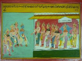 | Description / विवरण | Miniature painting based on Mahabharat depicting Sri Krishna with his sardars coming to court of King Dhritrashtra. Then Dhritrashtra with other men stood up in respect and welcame them. |