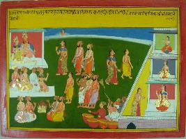 | Description / विवरण | Miniature painting based on Mahabharat - Adi parva depicting that king Dushyant adopted the son of Shakuntala and everybody seems very happy. Some musicians are playing musical instruments. |