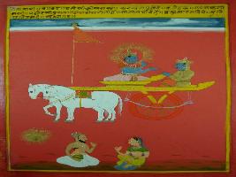 | Description / विवरण | Miniature painting based on Shri Bhagwat Gita. It depicts Arjun asking Krishna about knowledge and ignorance and Brahm marga. He also ask why clouds are not permanent. |
