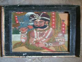 | Description / विवरण | It is a painting of Karauli darbar. Karauli is shown in sitting form. Man is visible wearing white garland in his neck and holding sword, He is having black moustache. |