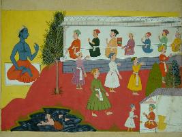 | Description / विवरण | Miniature painting depicting a hermitage where a blue coloured yogi is sitting in Padmasana and peoples are coming to take his blessings. It is an incomplete painting. |