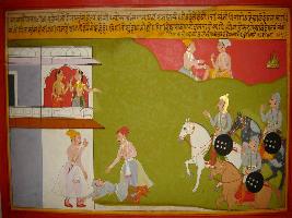 | Description / विवरण | Miniature painting based on Prithviraj Raso depicting Sanjogita talking to her friend in her palatial window. They are looking toward king Prithviraj and his commanders. Near her palace, two of his commanders are shown killing a soldier. |