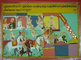 | Description / विवरण | Miniature painting based on Mahabharat depicting Shri Krishna with Kauravas going to a village. Every one in village came to see him. They went to Hastinapur through Raj marga. |