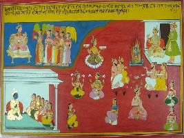| Description / विवरण | Miniature painting based on Mahabharat - Adi parva depicting Draupadi being coming out from yagna performed by king Draupadi at the upper left part. Krishna is depicted sitting with 1600 queens at the lower right part. Indra is depicted with his queen. At the lower left part king Pandu is shown sitting with his queen Kunti and Madri. |