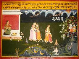 | Description / विवरण | Miniature painting based on Prithviraj Raso depicting Kurambhik telling the king about Situ van where beautiful flowers are blooming and beautiful women are playing. Kamdev and Rati devi is seen in the left side of the painting. |