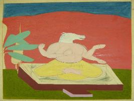 | Description / विवरण | Miniature painting based on horse-headed deity depicting deity in Asana position. It is incomplete painting. |