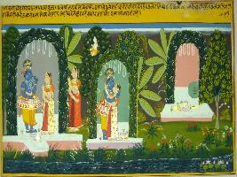 | Description / विवरण | Miniature painting based on Geet Govind depicting holy union of Krishna and Radha. |