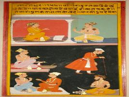 | Description / विवरण | Miniature painting based on Sarangadhar depicting two seated persons talking and at the lower part of painting a man walking on stick, few seated men and a seated sage are depicted. |
