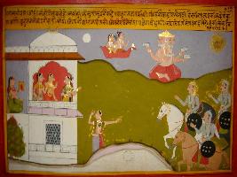| Description / विवरण | Miniature painting based on Prithviraj Raso depicting Sanjogita says to her friends that what she can do if god has chosen Prithviraj for her. At the left side a friend of Sanjogita informing her about the coming of Prithviraj. |