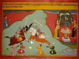 | Description / विवरण | Miniature painting based on Prithviraj Raso depicting a soldier musician in the battle playing horn, one musician playing Ghanta and another musician playing Tabla. Warriors are depicted fighting in the battle field. |