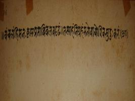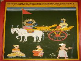 | Description / विवरण | Miniature painting based on Shri Bhagwat Gita. Arjun asking Krishna about unstable mind. In lower part, man is shown sitting with woman. Man is shown leaving. |