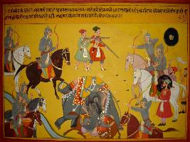 | Description / विवरण | Miniature painting based on Prithviraj Raso depicting a battle scene in which Ravan Kotwal brought elephants to the field and engage in fight but elephants themselves retreated from the field and trampled the army of Ravan. |