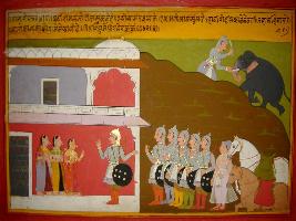 | Description / विवरण | Miniature painting based on Prithviraj Raso depicting Prithviraj talking with Sanjogita and her friends and describing how he pulled out the tusks of an elephant. The soldiers are seen in the left corner of the painting. |