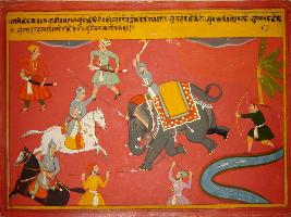 | Description / विवरण | Miniature painting based on Prithviraj Raso depicting army men trying to control the elephant of king Jaichand. |