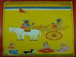 | Description / विवरण | Miniature painting based on Shri Bhagwat Gita. It is depiction of Krishna preaching Gita to Arjun. |