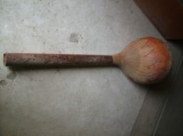 | Description / विवरण | This is a music instrument known as tumba, in the shape of a pumpkin which is a part of a double round base support of veena, black in colour, having three small holes on the top and big one on the bottom with flower petal shaped decorations in golden and red all around them. There are two holes at the belly. Partly damaged. Hollow from inside. |