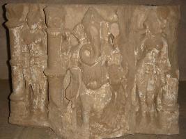| Description / विवरण | An independent sculpture of Ganesh is standing position wearing girdle beautiful head gear adorned with jewels. His upper part of neck is broken his attributes from right below can not be identified ii missing iii missing probably mace iv holding sweets. On the both side of Ganesh there is the depiction of two pillar with amlak design. toward the right side of Ganesh there is a depiction of a female chanwari bearer, who is holding the chanwari in her left hand and right hand is resting, she has beautiful head gear and adorned with jewels like girdle and tussle. Towards the right of chanwari beaver there is the depiction of a pillar with amlak designs. Toward the left of Ganesh image there is another chanwari bearer in standing position holding chanwari by her right hand, having the same description with the left chanwari bearer of Ganesh image. |