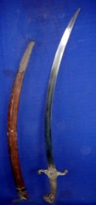 | Description / विवरण | Iron Kirch Sword having slightly curved blade and brass hilt in shape of lion head. The scabbard is of wooden with metal chaunthi. |