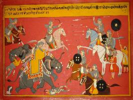 | Description / विवरण | Miniature painting based on Prithviraj Raso depicting a battle in which Ravan with his army attacked army of Prithviraj through elephant. |