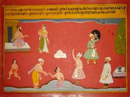| Description / विवरण | Miniature painting based on Prithviraj Raso depicting how vicious should be purified, they should take bath in Ganga for ablution, do the dharma abnegate Adharam. Do the good work, left the bad work. The daily work should be done as if a sage does. |