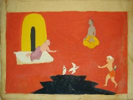 | Description / विवरण | Miniature painting depicting three people one is depicted killing bird with help of arrow but bow and arrow one absent. It is an incomplete painting. |