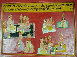 | Description / विवरण | Miniature painting based on Mahabharat depicting a messanger comng and telling the king that Krishna spent the night in Uplava s village. They will come today. Krishna is looking like god of three loks let alone yadavas. He is compared yadavas with Adiya Brihaspati and Budh. |