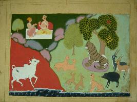 | Description / विवरण | Miniature painting based on Jataka katha depicting tiger sitting at middle and is surrounded by other forests animal such as jackal, deer, Rabbit, leopard stag at the left part. At the upper right part king is shown sitting with his minister. Below this cow is depicted. It is an incomplete painting. |