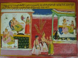 | Description / विवरण | Miniature painting based on Prithviraj Raso depicting Kurambhik telling the king that his planets are not moving well. After that king goes to Hamir s place in Shishir season. |