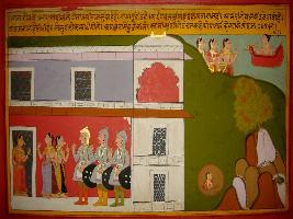 | Description / विवरण | Miniature painting based on Prithviraj Raso depicting Sanjogita and Prithviraj where Sanjogita informing him about the strength of her father s Samantas and she compared them with the Devtas. |