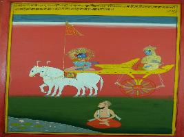 | Description / विवरण | Miniature painting based on Shri Bhagwat Gita. It depicts Krishna preaching Arjun that Mana is fickle and unstable. So try to control it. |