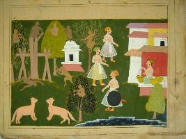 | Description / विवरण | An incomplete painting of Jataka story depicting a story of monkeys. The painting depicts how a fool monkey have face with death when he going to shows his bravery while in the left side a shopkeeper is seen in his shop. |