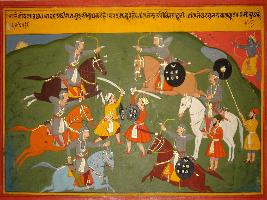 | Description / विवरण | Miniature painting based on Prithviraj Raso depicting fighting scene. Chandvardai compare his king s war capability with Lord Ram and Arjun and his arrows looks like rays of sun. |