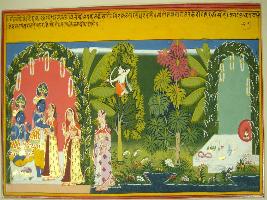 | Description / विवरण | Miniature painting based on Geet Govind depicting the meeting scene of Radha and Krishna. Painting depicts that Radha comes with her friend and meets Krishna. Near them the Yamuna river is flowing. Kamdev pointing Kambaan to them. |