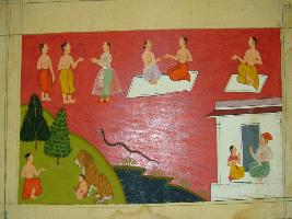 | Description / विवरण | An incomplete painting based on Jataka stay depicts that how a tiger looked after a boy. While in the upper part of the painting depict some men that talking each other and a couple is seen in the left side of the painting. |