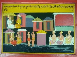 | Description / विवरण | Miniature painting based on Mahabharat depicting a messanger telling to the king that Shri Krishna has come to village with Pandavas. |
