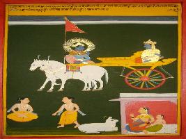 | Description / विवरण | Miniature painting based on Shri Bhagwat Gita. It depicts Krishna preaching Arjun that one who is having control over is scenes he wants to get anything through karma. |