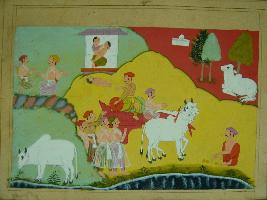 | Description / विवरण | Miniature painting depicting probably Jataka story. Two men are shown sitting and talking at the upper right part to its left, a woman is shown with child on her lap. At the middle portion of painting, a man is shown on cart and bunch of men following that. At the lower left, a man is shown sitting. At the upper left pat, a cow is depicted, it is an incomplete painting. |