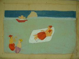 | Description / विवरण | Miniature painting depicting two men sitting at the lower right part. They are shown sleeping in the couch. Above this Brahma is shown sitting in Vayuyaan. It is an incomplete painting. |