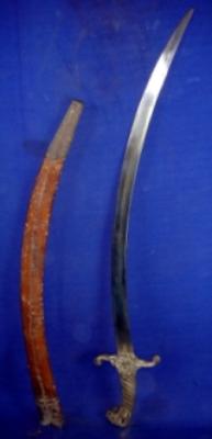 | Description / विवरण | Iron Kirch Sword having slightly curved blade and brass hilt in shape of lion head. The scabbard is of wooden with metal chaunthi. |