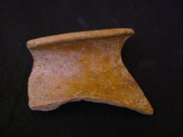 | Description / विवरण | It is a fine fabric red slipped well fired potsherd. Its rim is slightly turning outside with globular body. It is painted in wavy pattern in white colour on red background. It is associated with OCP. |